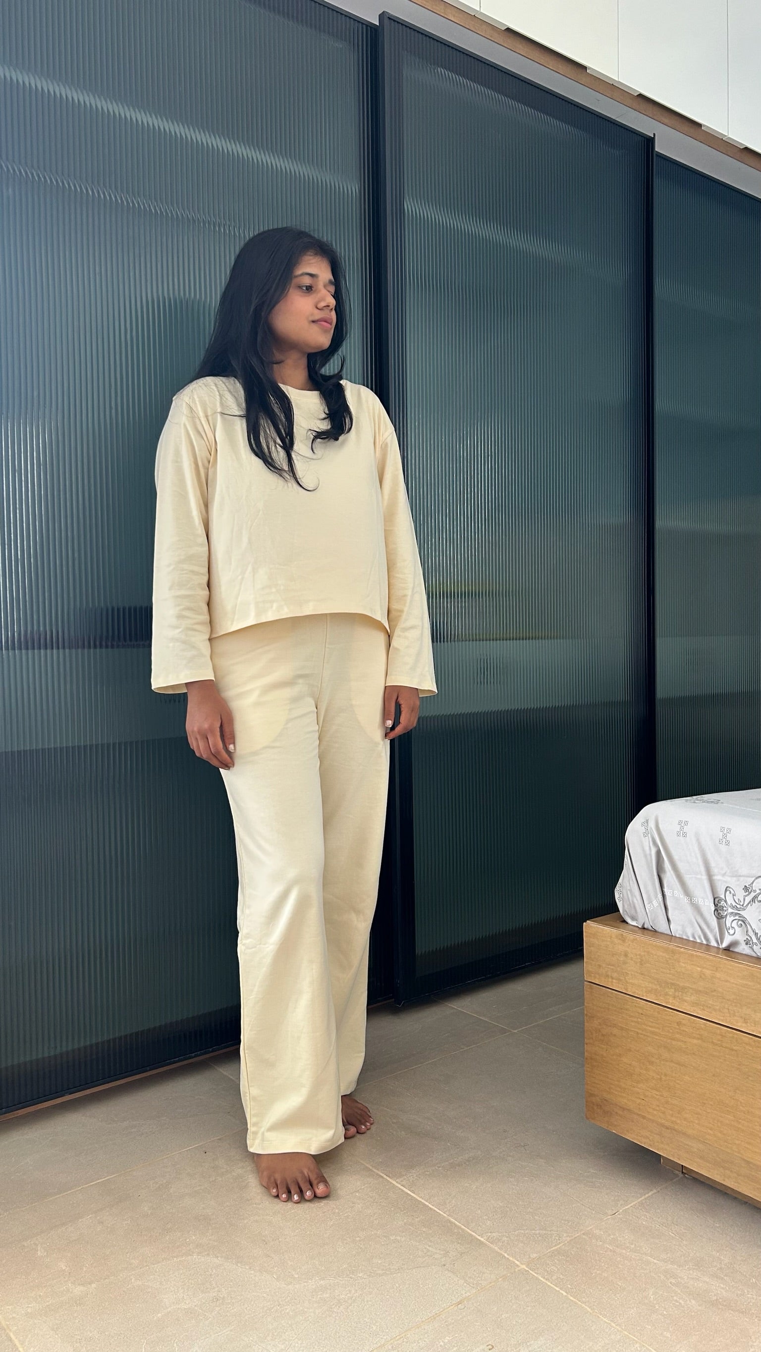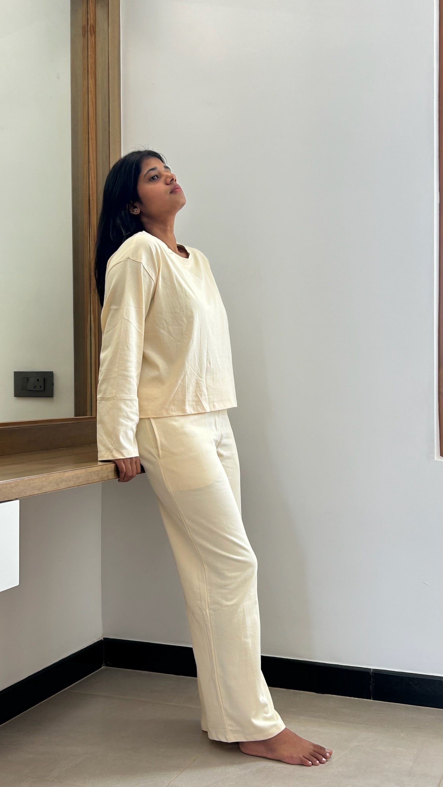 An all-ivory oversized knit co-ord crafted in 100% cotton for unmatched breathability and comfort. Designed with a relaxed silhouette of full sleeve crew neck top with flared pants added with pockects on both sides. Perfect for lounging or stepping out, this set redefines casual chic in a timeless neutral