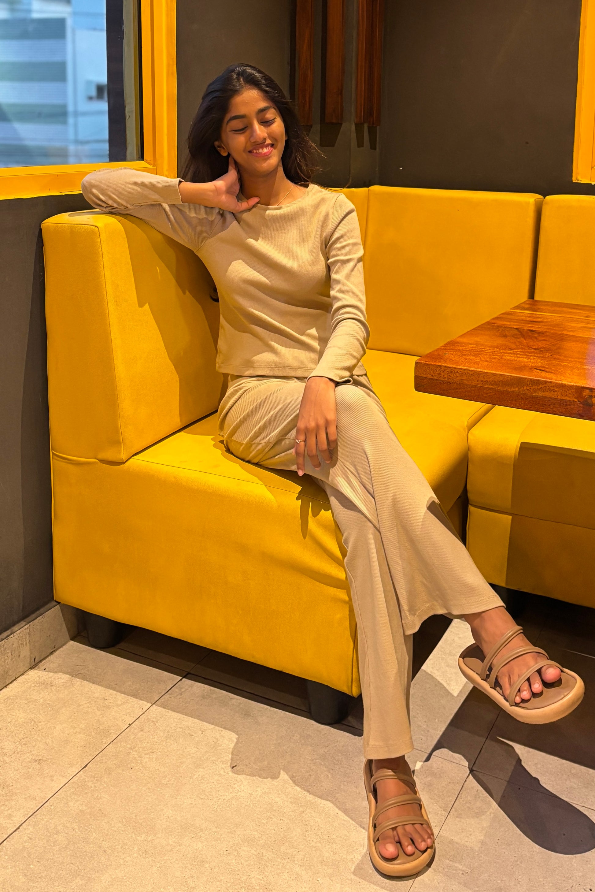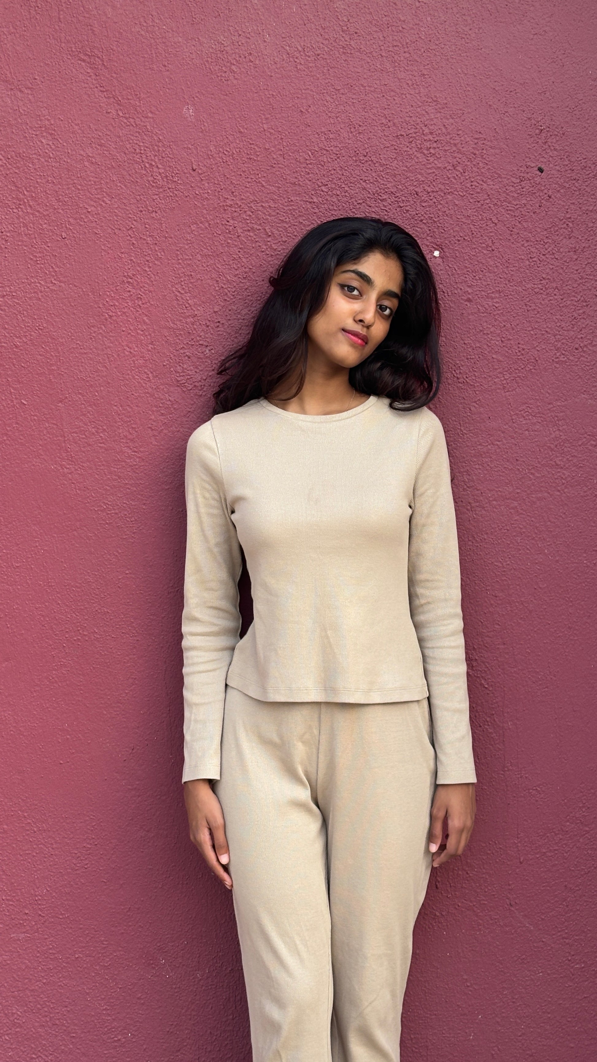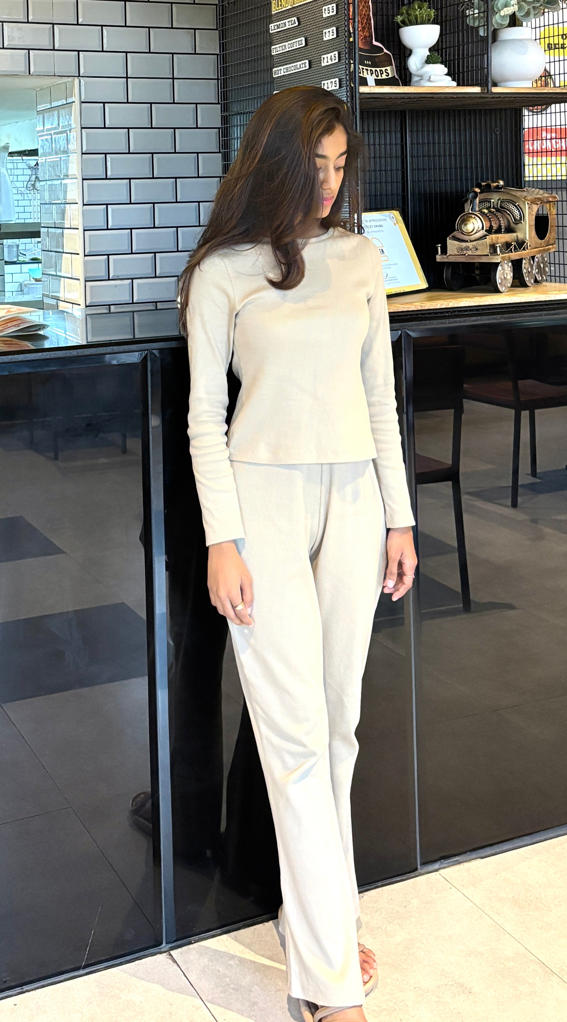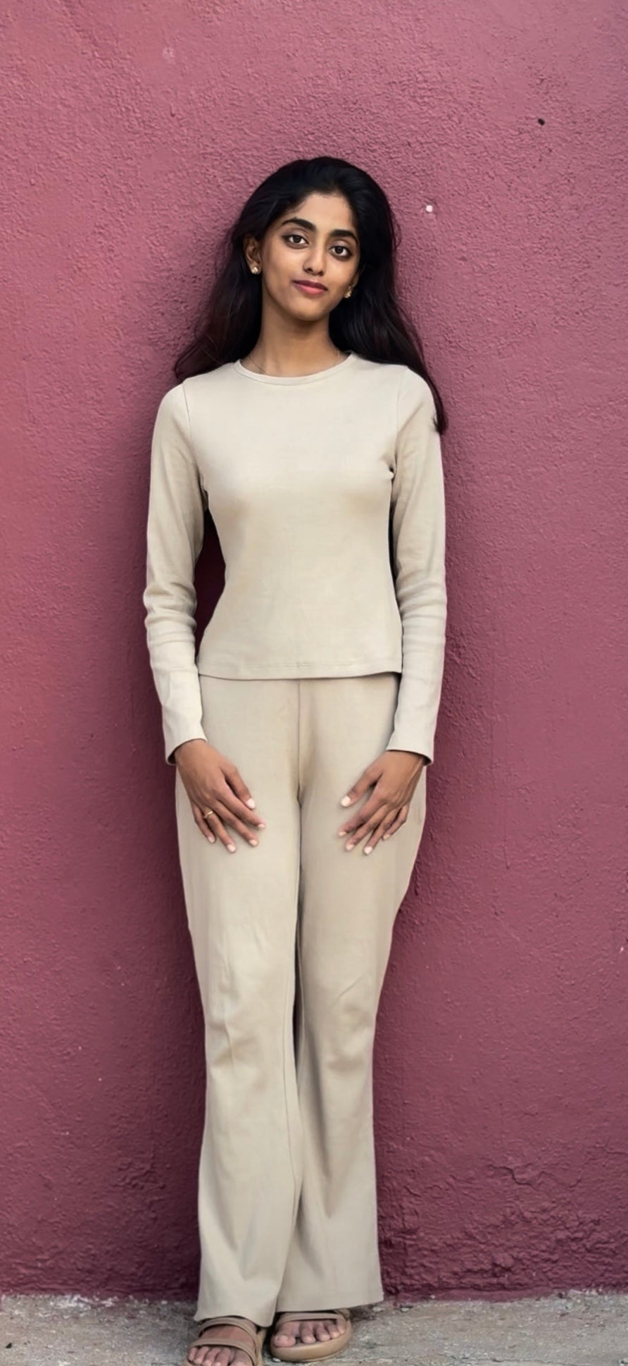 Close-neck, full-sleeve tee styled with sleek bootcut pants for a refined, modern silhouette.